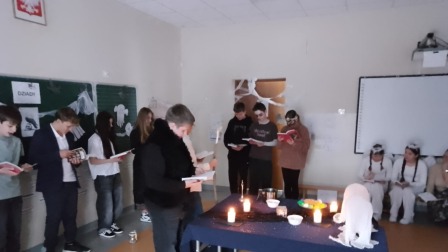 W dniu 24 listopada siódmoklasiści zaprosili uczniów klasy szóstej i ósmej na inscenizację „Dziadów” cz. II Adama Mickiewicza. Przedstawienie zostało przygotowane jako forma przybliżenia im treści lektury oraz tradycji obrzędów ludowych.