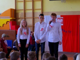 Święto Narodowe Trzeciego Maja to jedno z najważniejszych świąt w naszym kraju. W naszej szkole obchodzone było nadzwyczaj dostojnie i uroczyście, tym bardziej, że trwają obchody 100- lecia odzyskania niepodległości naszego kraju. Już kilka dni przed uroczystą akademią wszyscy uczniowie wraz z wychowawcami i panią od plastyki przygotowywali biało – czerwone kotyliony, natomiast uczniowie klas V, VI i VII pod okiem polonistki i nauczyciela muzyki ćwiczyli swoje role.
