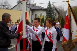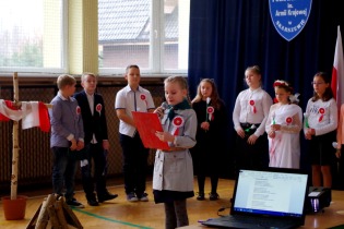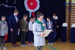 Na początku wszyscy odśpiewali Mazurka Dąbrowskiego podczas uroczystego wciągania flagi na maszt przez poczet flagowy. Następnie zaproszono uczniów i pracowników szkoły do przejścia na salę gimnastyczną, gdzie przywitano wszystkich uczestników obchodów i ponownie odśpiewano hymn w obecności pocztu sztandarowego. Akademię w tym roku przygotowali uczniowie klasy piątej, którzy recytowali wiersze i przypomnieli przemówienie Józefa Piłsudskiego z 1914 roku do żołnierzy Pierwszej Kompanii Kadrowej. Uwagę zwracała uczennica ubrana w białą szatę z biało-czerwonym wiankiem na głowie symbolizująca Polskę. Jednocześnie uczniowie poszczególnych klas przygotowali i odśpiewali pieśni żołnierskie, i tak: