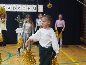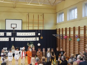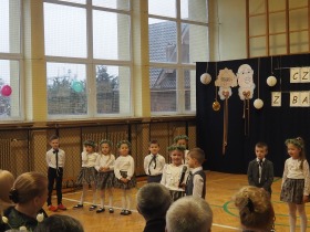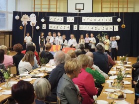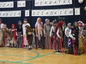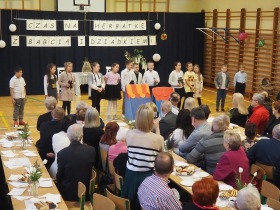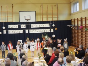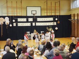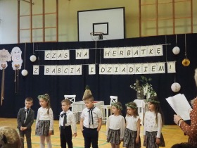 Życzyła długich lat życia, zdrowia, miłości szacunku, wspomniała także o cennym doświadczeniu i życiowej mądrości seniorów. Dzieci z oddziału przedszkolnego pod czujnym okiem Pani Edyty Waszak z wielkim przejęciem prezentowały skecz „Od dzieciństwa, do dorosłości”. Najmłodsze dzieci wywołały fale wzruszeń i lawinę śmiechu. Pierwszoklasiści przygotowani przez Panią Annę Balcerzyk wystąpili w inscenizacji pt: „Smutny bałwanek”.