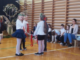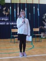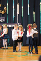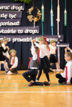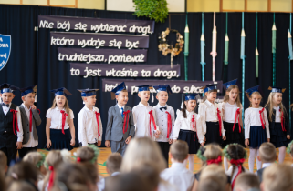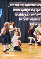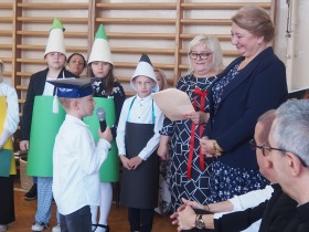 W następnej kolejności pierwszaki, przygotowane przez wychowawczynię p. Annę Balcerzyk, zaprezentowały swoje niezwykłe umiejętności. Motywem przewodnim części artystycznej były postacie przebrane w kolorowe kredki, które egzaminowały wspaniale przygotowane dzieci, pięknie recytujące wiersze i śpiewające piosenki.