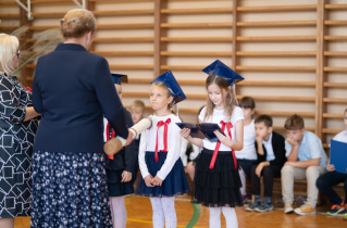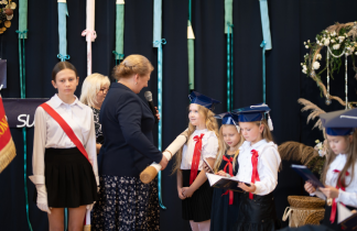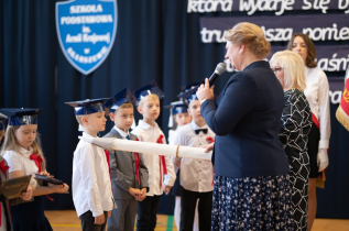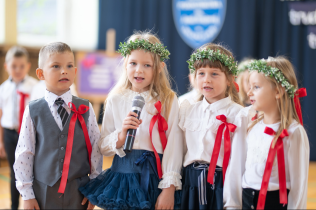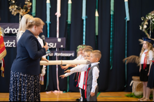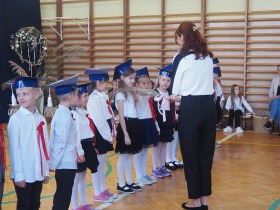 Następnie przedszkolaki, przygotowane przez swoją wychowawczynią p. Edytę Waszak, zaprezentowały swoje umiejętności wokalne, recytatorskie i taneczne. Mimo stresu związanego z publicznym występem, dzieci świetnie poradziły sobie z mikrofonem. Dyrektor szkoły dr Dorota Sobczak dokonała uroczystego pasowania i tym samym przyjęła wszystkie dzieci do społeczności przedszkolnej. Na pamiątkę tak ważnego wydarzenia każde dziecko otrzymało pamiątkowy dyplom.