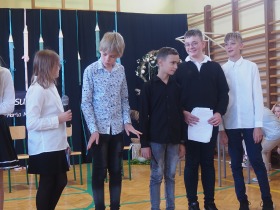 Przedstawiciele Samorządu Uczniowskiego wraz z opiekunem Panią Martą Jaśkiewicz przygotowali krótki, humorystyczny występ artystyczny dotyczący życia szkolnego.