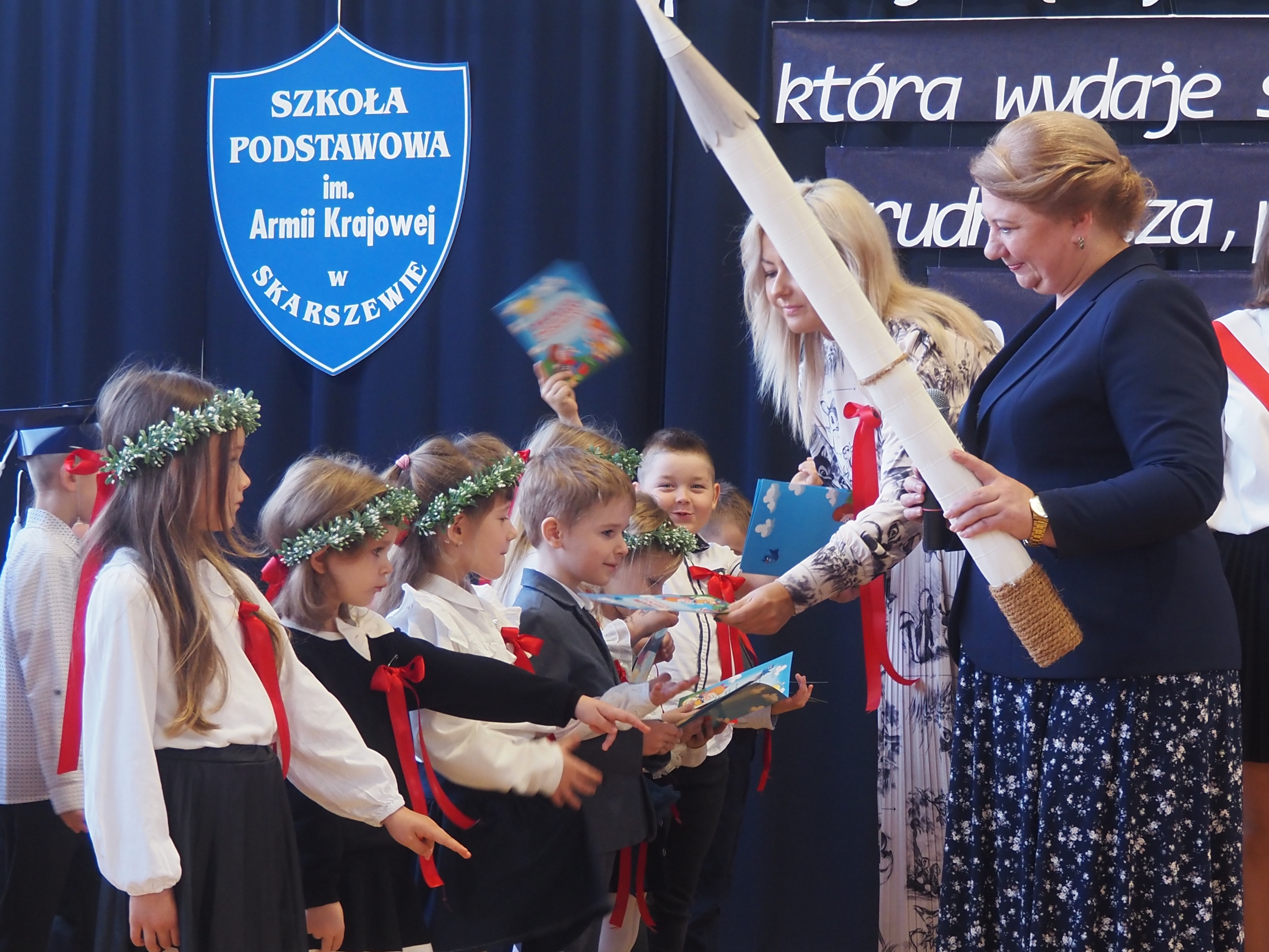 Po złożeniu ślubowania Pani Dyrektor dokonała symbolicznego pasowania na ucznia. Wielką kredką, jak czarodziejską różdżką, dotykała ramion swoich podopiecznych. Uczniowie otrzymali również swój pierwszy w życiu dokument - legitymację szkolną.