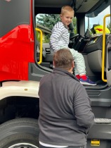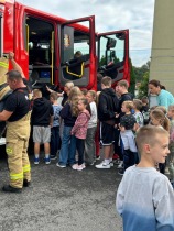 Po zakończeniu ćwiczeń na uczniów czekała miła niespodzianka – spotkanie ze strażakami. Uczniowie mieli możliwość zobaczyć z bliska wyposażenie pojazdu, dotknąć niektórych elementów sprzętu oraz posłuchać opowieści strażaków o ich codziennej pracy. To była nie tylko atrakcja, ale również cenna lekcja pokazująca, jak wiele odwagi i odpowiedzialności wymaga wykonywanie zawodu strażaka.