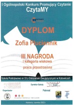 Szkolne typowania okazały się trafne, gdyż wśród laureatów znalazło się aż sześcioro uczniów naszej szkoły w 3 kategoriach. W grupie przedszkolnej III miejsce zajęła Zofia Płuciennik z oddziału przedszkolnego, wykonując pracę przestrzenną.