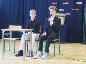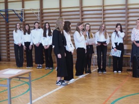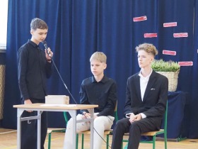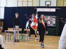 Następnie głos zabrała Pani Dyrektor, która przypomniała o znaczeniu Armii Krajowej w historii Polski. Pani Dorota Sobczak połączyła się telefonicznie z Panem majorem Kazimierzem Wiktorowiczem ps. Dąbrowa, który co roku odwiedzał naszą szkołę i brał udział w uroczystościach Dnia Patrona. Niestety zdrowie nie pozwoliło Panu Kazimierzowi odwiedzić nas w tym roku i opowiedzieć o żołnierzach, będących symbolem odwagi, poświęcenia i miłości do ojczyzny. Życzyliśmy więc Panu Wiktorowiczowi dużo zdrowia i wyraziliśmy nadzieję na ponowne spotkanie w murach naszej szkoły.