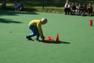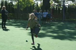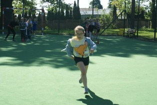 Pozostali uczniowie z klas IV-VII na boisku szkolnym zmagali się z pokonaniem sprawnościowych torów przeszkód: