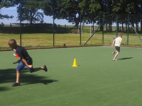 Pozostali uczniowie z klas IV-VII na boisku szkolnym zmagali się z pokonaniem sprawnościowych torów przeszkód.