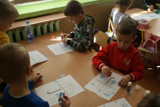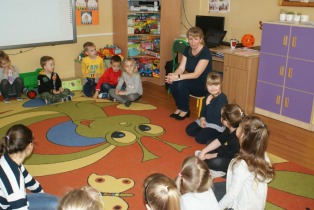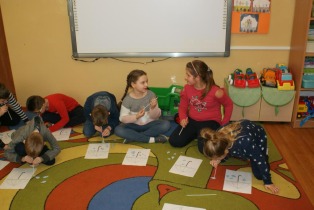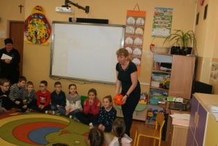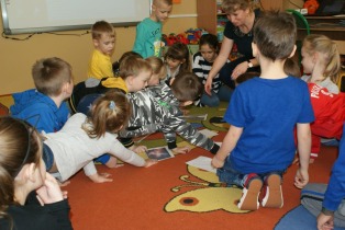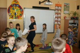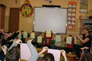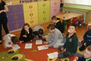 Zadania miały na celu ćwiczenie aparatów artykulacyjnych: warg i języka. Dzieci pracowały tez nad prawidłowym torem oddechowym. Dmuchając na kartki papieru sprawdzały, czy prawidłowo oddychają. Słuchając opowiadania „Sowa sprząta swoje mieszkanie”, dokładnie usprawniliśmy swoje buzie. Rozluźnieni i przygotowani do pięknej wymowy przystąpiliśmy do dalszej części zajęć, w której ćwiczenia artykulacyjne zostały połączone z zajęciami logorytmicznymi. Uczniowie maszerowali w takt piosenki „Ludowa poleczka”, pamiętając