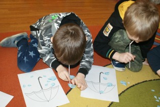 W Trakcie zabaw mieliśmy możliwość sprawdzenia swojego słuchu. Dzieci odgadywały skąd pochodzą dźwięki, które usłyszały. Wszyscy świetnie poradzili sobie z tym zadaniem. Na zakończenie jeszcze raz sprawdziliśmy czy potrafimy prawidłowo oddychać. Dzieci otrzymały słomki i za ich pomocą musiały przenieść krople deszczu pod parasol. Przy tym zadaniu było mnóstwo śmiechu. Wszyscy bardzo dobrze sobie z nim poradzili.