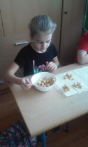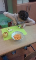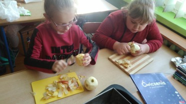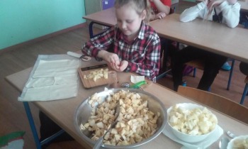 Od 5.02 do 9.02 uczniowie klasy III realizowali tematy związane z potrawami, ich smakami i zapachami. W ramach zajęć lekcyjnych dzieci próbowały różnych przypraw, poznały ich smak i zapach. W środę, 7.02., dzieci smakowały herbat z cynamonem i z kardamonem. Następnego dnia wspólnie piekliśmy ciasteczka z jabłkami. Dzieci obrały i pokroiły jabłka, po czym przygotowały ciasteczka, które wszystkim smakowały. W piątek zrobiliśmy sałatki owocowe. Każdy przyniósł swoje ulubione owoce. Były jabłka, gruszki, mandarynki, banany, winogrono i truskawki. Wszystkie dzieci bardzo dobrze posługiwały się nożem podczas obierania owoców. Pracowały w ciszy i skupieniu. Zachowały porządek na swoich stanowiskach.
