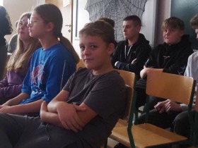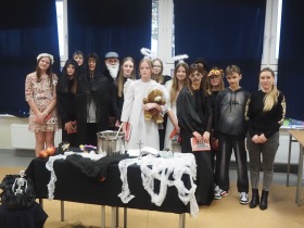 Dnia 14.11.24r. uczniowie siódmej klasy zaprosili koleżanki i kolegów z klasy szóstej i ósmej oraz nauczycieli na niecodzienną lekcję języka polskiego czyli na inscenizację „Dziadów” cz. II naszego wieszcza narodowego Adama Mickiewicza.