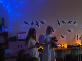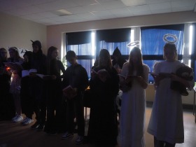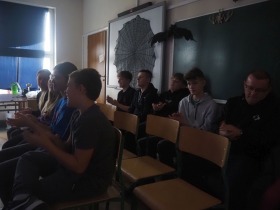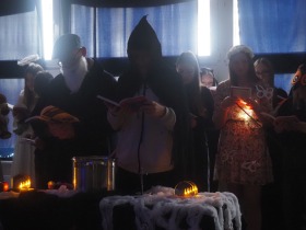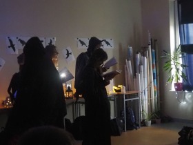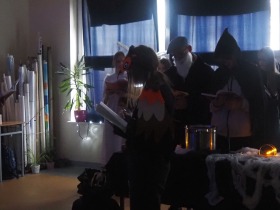 Za sprawą magii teatru i naszej wyobraźni w ten listopadowy pochmurny dzień przenieśliśmy się gdzieś na Litwę do kaplicy przycmentarnej, gdzie byliśmy świadkami niezwykłego widowiska, jakim był pogański obrzęd dziadów, polegający na wywoływaniu duchów i chęci udzielenia im pomocy. Za oknami hulał wiatr, a blask świec i lampionów tworzył tajemniczą i nieco mroczną aurę. Młodzi aktorzy z przejęciem wcielili się w swoje role, a ich kostiumy nadawały jeszcze autentyczności wydarzeniu. Guślarz przypomniał nam najważniejsze prawdy moralne, a chór dodatkowo je zaakcentował, uświadamiając nam, że: „Kto nie był ni razu człowiekiem, temu człowiek nic nie pomoże." Oby ta mądrość ludowa była obecna w naszej świadomości.