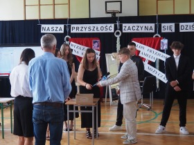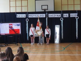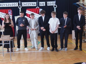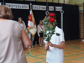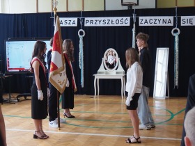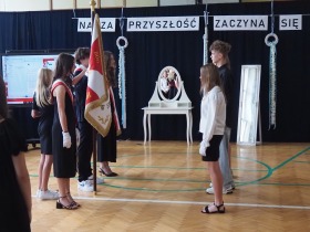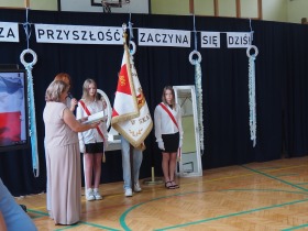 Następnie uczniowie klasy ósmej przekazali sztandar szkoły koleżankom i kolegom z klasy siódmej, symbolicznie oddając w ich ręce odpowiedzialność za kultywowanie tradycji.