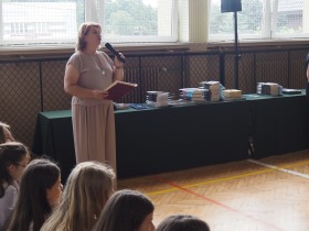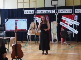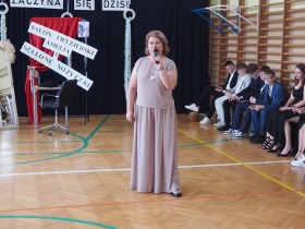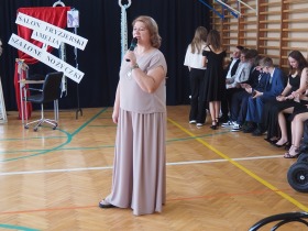 Pani Dyrektor, która w ciepłych słowach podsumowała miniony rok, gratulowała uczniom osiągnięć a szczególne słowa skierowała do absolwentów życząc im odwagi i wiary we własne możliwości na nowym etapie ich życia.