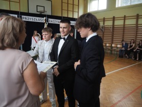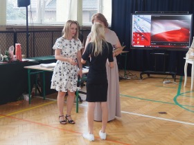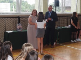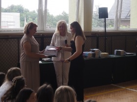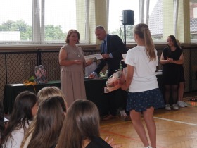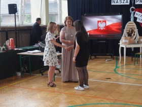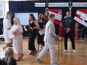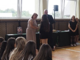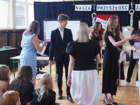 Podziękowania otrzymali również rodzice uczniów klasy ósmej, którzy aktywnie wspierali życie szkoły i angażowali się w różnorodne działania na jej rzecz. W uznaniu za dobrą współpracę Pani Dyrektor wręczyła im pamiątkowe dyplomy.