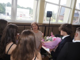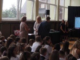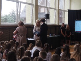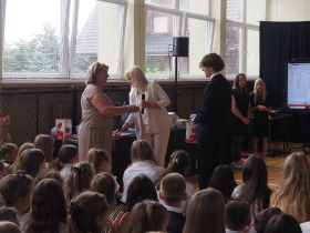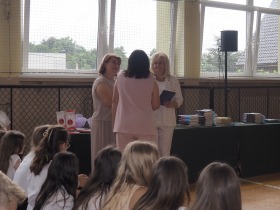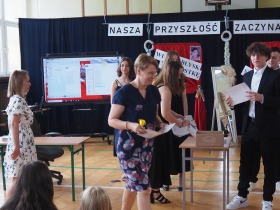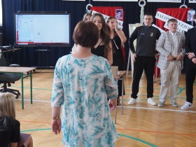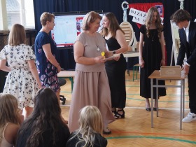 Ósmoklasiści wyrazili swoją wdzięczność wszystkim nauczycielom i pracownikom szkoły wręczając im dyplomy własnego projektu oraz symboliczne puchary wykonane na drukarce 3D – drobne gesty jako wyraz wdzięczności za wszystkie wspólne lata.