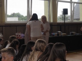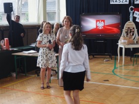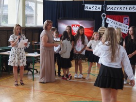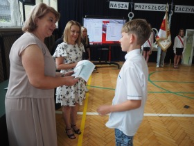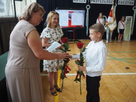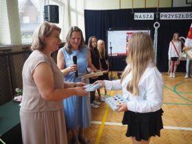 W trakcie uroczystości Pani Dyrektor wraz z wychowawcami poszczególnych klas wręczyła świadectwa z wyróżnieniem uczniom klas 4–8, a także nagrody za szczególne osiągnięcia sportowe, przyznane ósmoklasistom. Nie zabrakło również podziękowań dla wolontariuszy działających w ramach szkolnych inicjatyw – wśród nich znaleźli się uczniowie klas 4–8. Ich postawa to powód do dumy dla całej społeczności szkoły.
