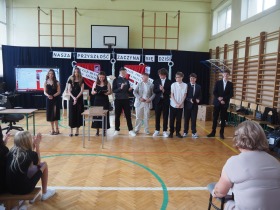 W imieniu całej społeczności uczniowskiej klas 4–7 ósmoklasistów pożegnano żartobliwie przygotowanymi słowami w formie „Echa szkolnego”, a klasa siódma wręczyła im drobne upominki – jako symbol dobrej pamięci i życzeń powodzenia na dalszych etapach nauki.