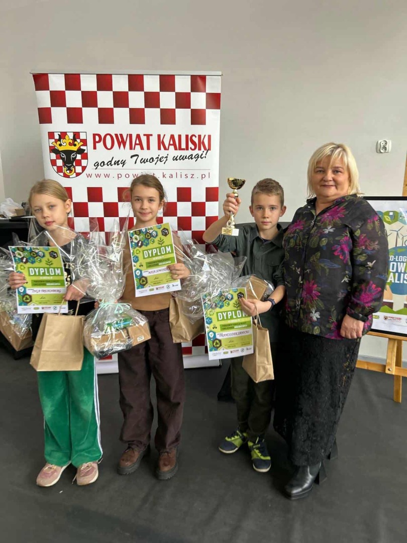 22 października 2025 roku w Zespole Szkół im. Stanisława Mikołajczyka w Opatówku odbył się Powiatowy Turniej Wiedzy i Umiejętności Ekologicznych. Celem wydarzenia było pogłębianie wiedzy z zakresu ekologii i ochrony środowiska, kształtowanie postaw proekologicznych, a także rozwijanie umiejętności praktycznego wykorzystania posiadanych wiadomości podczas wykonywania różnorodnych zadań konkursowych. Każda szkoła podstawowa mogła zgłosić dwie drużyny: jedną 3-osobową drużynę w kategorii klas I–III oraz jedną 3-osobową drużynę w kategorii klas IV–VIII. Naszą szkołę reprezentowali: uczniowie z klasy III - Maja Sowińska, Iga Tresenberg oraz Franciszek Janicki (opiekun Anna Balcerzyk) w kategorii klas IV–VIII – Julia Osiewała , Hanna Wawrzyniak i Ivetta Biskup (opiekun Monika Raniś). Tego dnia uczestnikom zmagań towarzyszyli: Starosta Kaliski Jan Adam Kłysz, Wicestarosta Kaliski Paweł Kaleta, Członek Zarządu Powiatu Kaliskiego i Sekretarz Gminy Opatówek Krzysztof Dziedzic, Wiceprzewodniczący Rady Powiatu Kaliskiego Wincenty Nowak, Dyrektor Zespołu Szkół im. Stanisława Mikołajczyka w Opatówku Marek Janiak. Turniej cieszył się ogromnym zainteresowaniem – wzięło w nim udział ponad stu uczniów z całego powiatu kaliskiego. Starsi uczestnicy rywalizowali w konkurencjach sprawdzających wiedzę teoretyczną z zakresu ekologii, natomiast młodsi mierzyli się z zadaniami praktycznymi, wymagającymi pomysłowości, współpracy i zdolności manualnych. Nasi uczniowie pracowali wytrwale i zgodnie, co przełożyło się na wyniki. Z ogromną radością informujemy, że w kategorii klas I–III nasi uczniowie zdobyli III miejsce. Podczas części praktycznej wykonali oryginalną pracę techniczną, która zachwyciła jury pomysłowością i estetyką. Z surowców wtórnych stworzyli miniaturową makietę przedstawiającą swoją rodzinną wieś. W makiecie znalazły się m.in. domek z kartonu, silos na kukurydzę, pojemniki na śmieci, poidło i siano dla konia, drzewa z rolek po papierze oraz kurnik z tektury. Nie zabrakło też stawu wykonanego z folii. Uczniowie pokazali, że nawet z pozornie niepotrzebnych rzeczy można stworzyć coś wartościowego i inspirującego. Gratulujemy naszym młodym ekologom wspaniałego wyniku i dziękujemy za godne reprezentowanie szkoły.