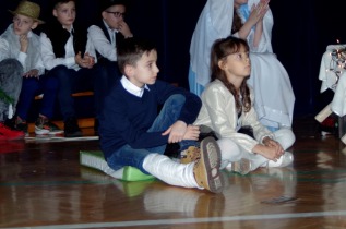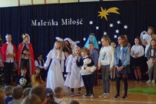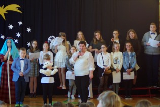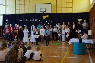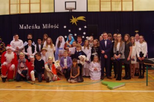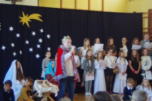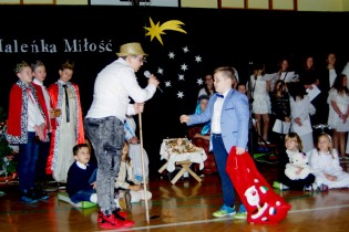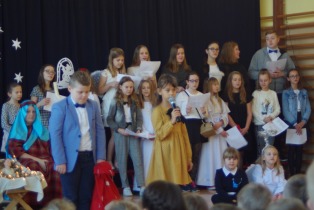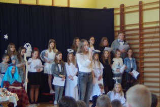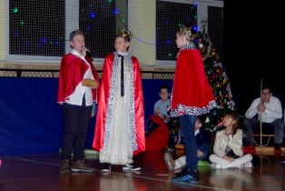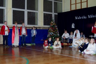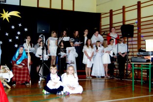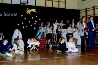 Tego wieczoru, zazwyczaj rozgadani i rozbawieni uczniowie, w ciszy i skupieniu, z anielskimi uśmiechami na buziach, oczekiwali na swój świąteczny występ. Poprzedziło go powitanie gości przez Panią Dyrektor Magdalenę Mikołajczyk słowami: „ Maleńka Miłość niech zrodzi się w każdym z nas, w każdej rodzinie, w naszej szkole. Dziękuję przyjaciołom szkoły, sponsorom, rodzicom za wszelkie dobro”. W klimat zbliżających się świąt wprowadziły słowa ks. Grzegorza Mituły, przypominające historię i rangę opłatka, którym się dzielimy w Wigilię Bożego Narodzenia oraz odczytanie fragmentu z Pisma Świętego. Następnie wszyscy mieli okazję złożyć sobie życzenia, które wypływały z głębi serca. W tle Trzej Mędrcy ze Wschodu przestępowali już niecierpliwie z nogi na nogę, w oczekiwaniu na jasełka sprawdzając, czy aby złoto, kadzidło i mirra nie uległy zniszczeniu.