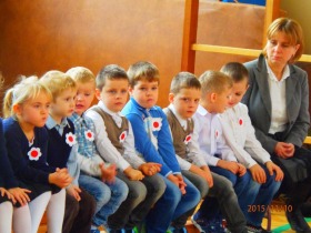 Pierwsza zaczęła klasa „0”, która odśpiewała nasz hymn narodowy. Wszyscy pozostali im towarzyszyli. Uczniowie poszczególnych klas również mieli gotowe do odśpiewania ciekawe utwory, a mianowicie: „Rozszumiały się wierzby płaczące”, „O mój rozmarynie”, „Rozkwitały pąki białych róż” i wiele innych. Widoczne było, że występujący czuli patriotyczny klimat, a wystrój sali temu odpowiadał, ponieważ miał biało-czerwone barwy. Pan Tomasz, muzyk naszej szkoły, przygrywał melodie na swoim instrumencie, a uczennica klasy VI pod koniec zagrała na skrzypcach „Rotę”. Młodzież i dzieci przyglądali się występowi.