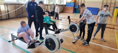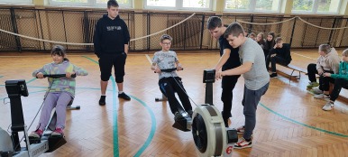 Nasza szkolna sala gimnastyczna została wyposażona w ergometry wioślarskie na których uczniowie klas V-VIII mieli szansę spróbować swoich sił pod okiem trenera, który udzielał cennych wskazówek dotyczących techniki wioślarskiej oraz motywował do osiągania lepszych wyników.