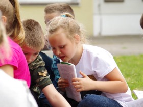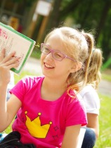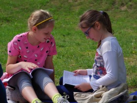 Trzecia klasa czyta na trawie