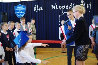 Uroczystym momentem było wprowadzenie wcześniej poświęconego w czasie Mszy Świętej sztandaru. Nastąpiła ceremonia symbolicznego aktu wbijania gwoździ honorowych przez sponsorów. Poczet sztandarowy rodziców przekazał sztandar Dyrektorowi Szkoły, który złożył uroczystą przysięgę. Następnie Dyrektor przekazał sztandar uczniom. Przedstawiciele klas, nauczycieli, rodziców, pierwszaki ślubowali nosić ten sztandar z godnością i honorem.