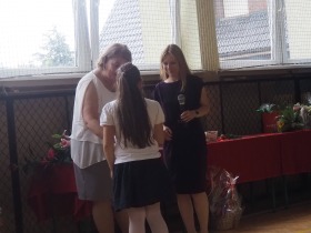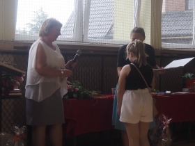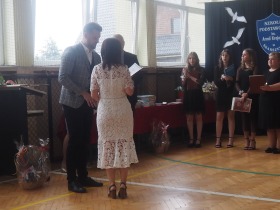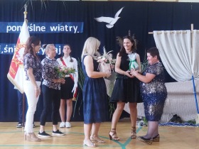 Nastąpiło również oficjalne przekazanie sztandaru szkoły przez poczet sztandarowy uczniom, którzy w przyszłym roku szkolnym będą pełnić tą zaszczytną funkcję.