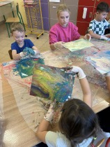 Podczas warsztatów dzieci eksperymentowały z farbami, mieszając różne kolory w kubeczkach, a następnie przelewając je na specjalne maty. Proces ten umożliwił rozlewanie farby po całości, tworząc unikalne kompozycje. Dzięki temu powstały kolorowe i abstrakcyjne dzieła, które zachwyciły wszystkich swoją oryginalnością. Była to technika wektorowa, która pozwalała na swobodną ekspresję i kreatywność.