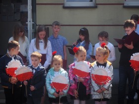 Uczniowie klasy V przybliżyli wszystkim to ważne i znaczące historyczne wydarzenie, przygotowując montaż słowno – muzyczny. W śpiew piosenki „Witaj maj, 3 maj” włączyli się wszyscy uczniowie oraz pracownicy szkoły, a echo ich niosło się po całej okolicy.