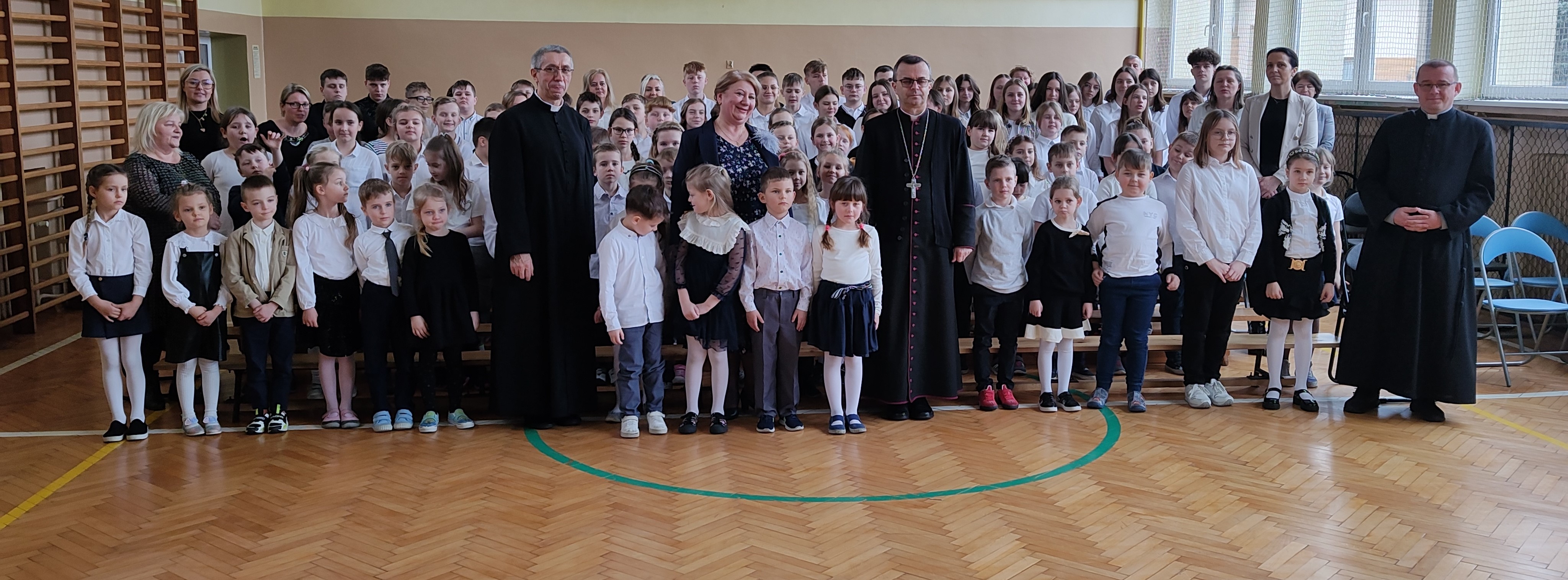 Na powitanie społeczność szkolna przywitała zacnego gościa piosenką "Bądź pozdrowiony gościu nasz". Następnie uczniowie naszej szkoły skierowali słowa powitania do ks. Biskupa, dzieląc się swoimi rozterkami, ale i radościami oraz prosząc o błogosławieństwo. Społeczność szkolna złożyła w przeddzień imienin również życzenia Księdzu Proboszczowi Grzegorzowi. Następnie czcigodnego gościa powitała Pani Dyrektor Dorota Sobczak. Przywołała pasterskie credo ks. Biskupa: „Miłość Chrystusa przynagla nas” jako wspólny element posługi zarówno duchowieństwa jak i pracowników oświaty wobec bliźniego. W odpowiedzi na zaproszenie ks. bp. zwrócił się do zebranych podkreślając, jak wielką wartością dla dzieci i młodzieży jest możliwość nauki, ale i wzrastanie w miłości. Podkreślił, jakie znaczenie ma możliwość przebywania wśród rówieśników w szkole oraz jak ważne jest pomaganie we wzrastaniu wszystkim bez wyjątku uczniom. Ksiądz Biskup wyraził swoją wdzięczność wszystkim nauczycielom i pracownikom za trud wkładany w wychowanie młodego pokolenia.