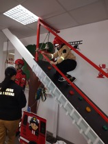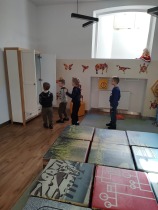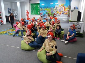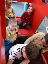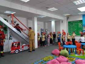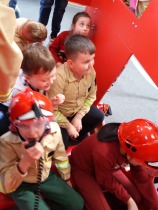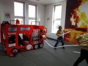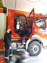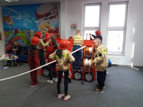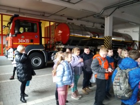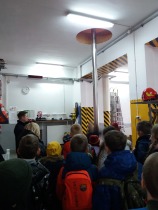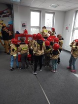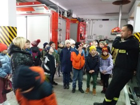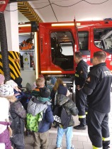 Kolejnym punktem naszej wycieczki była wizyta w Państwowej Straży Pożarnej. Uczniowie naszej szkoły odbyli lekcję w salce edukacyjnej. Była to okazja do pogadanki na temat bezpiecznego zachowania w domu i szkole. Podczas zajęć dzieci zakładały mundury i hełmy strażackie. Wcieliły się w rolę strażaków i brały czynny udział w akcji ratowania kota. W czasie wizyty strażacy zaprezentowali dzieciom i opiekunom pojazdy pożarnicze, sprzęt ratowniczy i gaśniczy. Obserwowaliśmy pokazowy zjazd po ześlizgu. Na koniec odwiedzin dzieci przekazały strażakom podziękowania i życzenia w formie plastycznej.