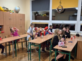 Zabawie towarzyszył także poczęstunek – Rada Rodziców podarowała każdemu uczestnikowi słodki wafelek oraz napój, dodatkową porcję energii zapewniały przekąski i napoje zapewnione przez rodziców.