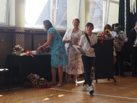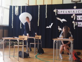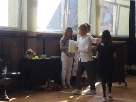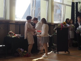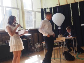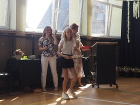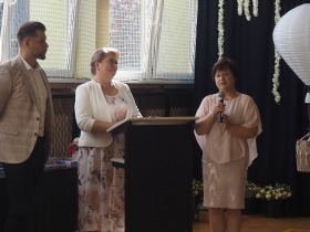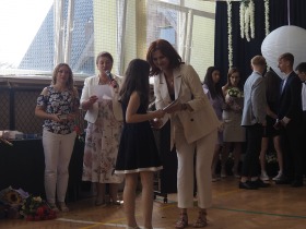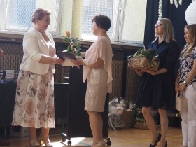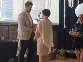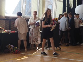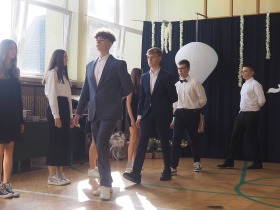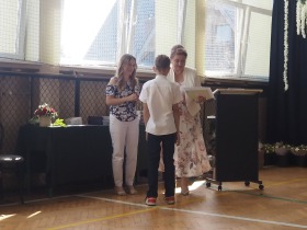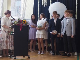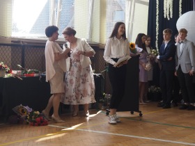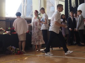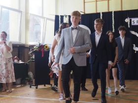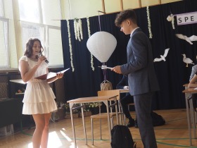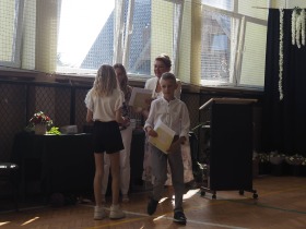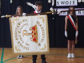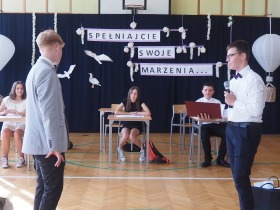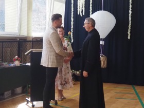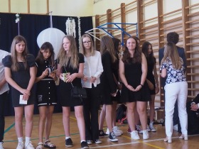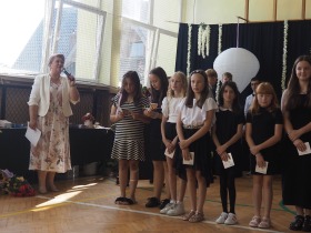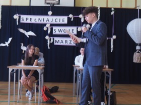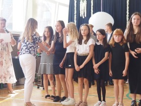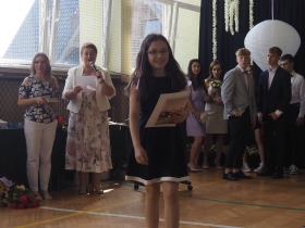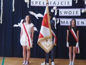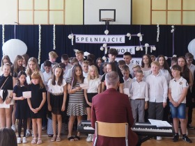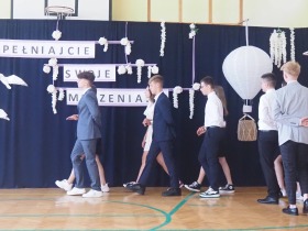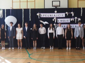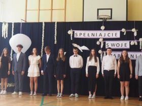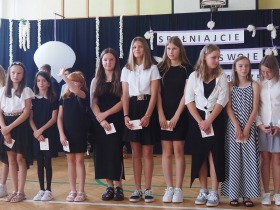 W tym roku szkolnym pożegnaliśmy naszych absolwentów klasy ósmej mottem: "Spełniajcie swoje marzenia...". Samorząd uczniowski powitał zgromadzonych gości: Pana Wójta Michała Kraszkiewicza, Panią Dyrektor Dorotę Sobczak , zaproszonych rodziców, uczniów oraz grono pedagogiczne. Uczniowie pięknie zatańczyli poloneza, a w części artystycznej przedstawili śmieszne skecze wzięte z życia naszej szkoły. Była godzina wychowawcza, lekcja języka polskiego i angielskiego, lekcja muzyki, biologii i matematyki. Wszystko "przyprawione" odrobiną humoru i zabawy, nawet nasza "Pani Woźna- grana przez Szymona" miała swoje 5 minut na kontrolę obuwia wśród uczniów. Pięknie zaprezentowali się również uczniowie klasy siódmej, którzy przygotowali tradycyjne echo o każdym z uczniów klasy ósmej i jeden utwór dedykowany dla wychowawcy kl. 8 - Pani Agnieszki Bryły. Po części artystycznej nastąpiło uroczyste przekazanie Sztandaru Szkoły, odśpiewanie hymnu państwowego i wręczenie świadectw z wyróżnieniem dla uczniów kl. 4-8. Pani Dyrektor oficjalnie pożegnała także odchodzących pracowników szkoły: Panią Elżbietę Kupaj - nauczyciela matematyki, Księdza Grzegorza Mitułę - uczącego religii i Panią Agatę Magdzicką - pedagoga specjalnego. Na koniec były podziękowania, wspomnienia, przemówienia, kwiaty oraz bardzo miłe spotkanie przygotowane przez Radę Rodziców z klasy ósmej. DZIĘKUJEMY!