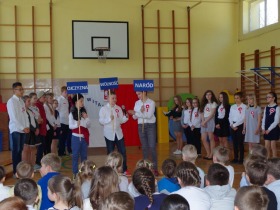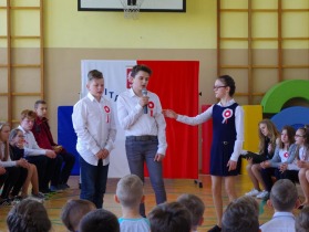 Święto Narodowe Trzeciego Maja to jedno z najważniejszych świąt w naszym kraju. W naszej szkole obchodzone było nadzwyczaj dostojnie i uroczyście, tym bardziej, że trwają obchody 100- lecia odzyskania niepodległości naszego kraju. Już kilka dni przed uroczystą akademią wszyscy uczniowie wraz z wychowawcami i panią od plastyki przygotowywali biało – czerwone kotyliony, natomiast uczniowie klas V, VI i VII pod okiem polonistki i nauczyciela muzyki ćwiczyli swoje role.