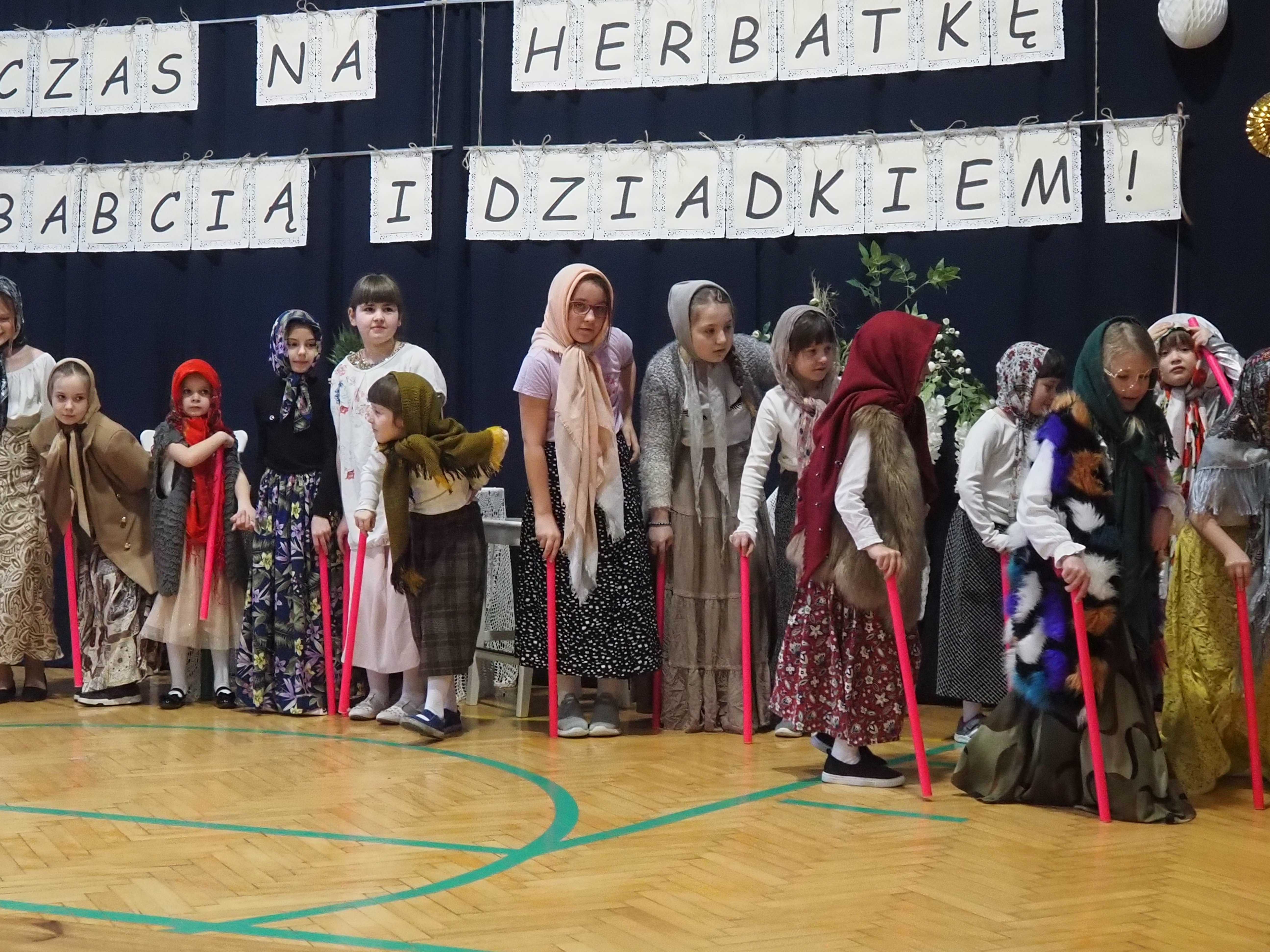 Babcie i Dzidkowie podziwiali piękne stroje i doskonale wyuczone kwestie. Następnie z humorystycznym akcentem wkroczyły na scenę babuszki z grupy tanecznej. Dzieci bardzo realistycznie wcieliły się w rolę babć. Barwne stroje i rekwizyty do tańca cieszyły oko widzów. Uczniowie z klasy III zainspirowani energią, dobrocią i poczuciem humoru Babć i Dziadków pod okiem Pani Marty Czerkawskiej wystąpiły w skeczu pt: „ Babcie i Dziadkowie -jacy są naprawdę?”. Dzieci za pomocą lornetki obserwowały zajęcia babci i dziadka.