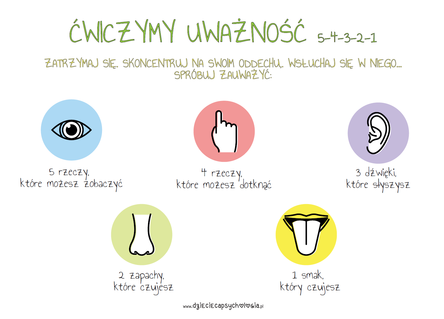 W ćwiczeniu uważności niezwykle ważne jest zatrzymanie i ODDECH. Kiedy będziecie praktykowali ćwiczenie 5-4-3-2-1, najpierw: wyrównanie i skupienie się na oddechu.