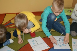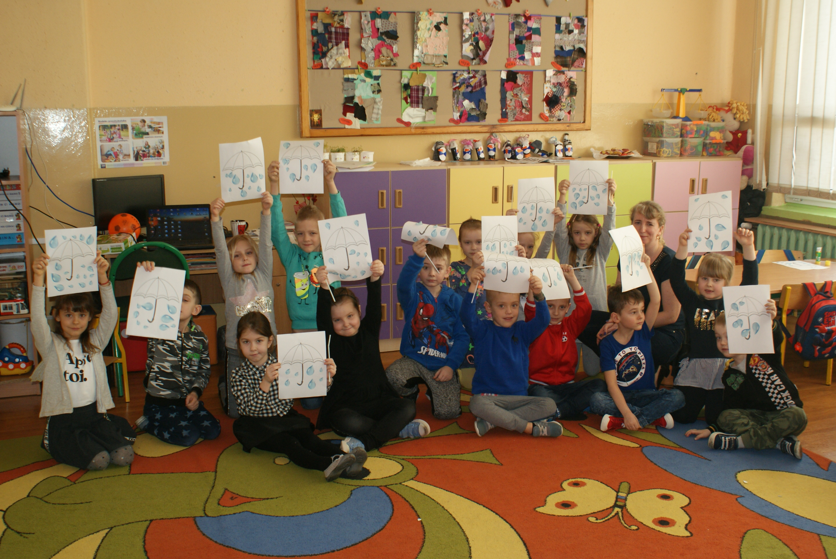 W Trakcie zabaw mieliśmy możliwość sprawdzenia swojego słuchu. Dzieci odgadywały skąd pochodzą dźwięki, które usłyszały. Wszyscy świetnie poradzili sobie z tym zadaniem. Na zakończenie jeszcze raz sprawdziliśmy czy potrafimy prawidłowo oddychać. Dzieci otrzymały słomki i za ich pomocą musiały przenieść krople deszczu pod parasol. Przy tym zadaniu było mnóstwo śmiechu. Wszyscy bardzo dobrze sobie z nim poradzili.