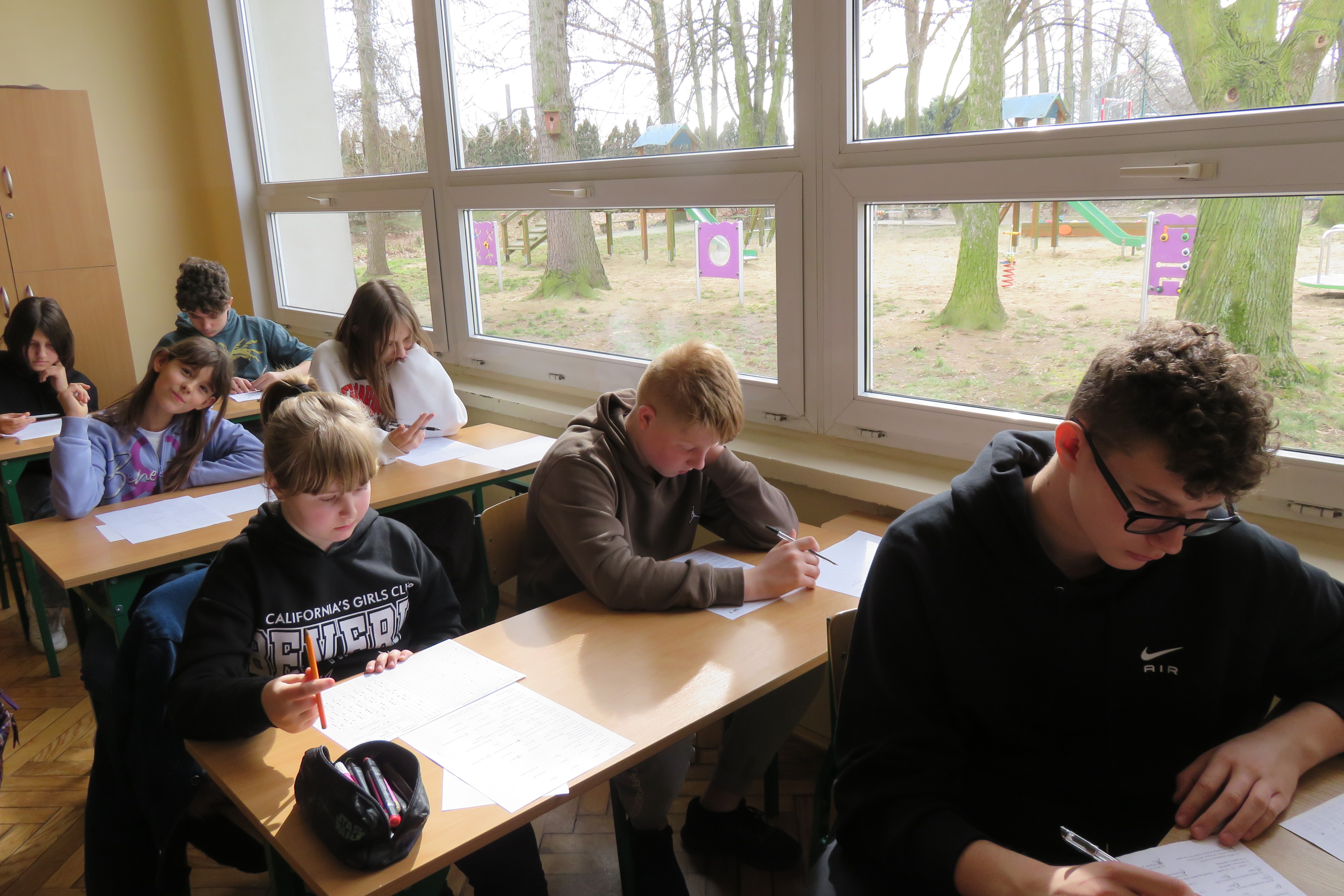 3 uczniów z klasy 7 SP – Zuzanna Kurczbuch, Szymon Nogaj i Oliwier Żarnecki oraz 5 uczniów z klasy 8 SP – Paweł Nogaj, Julia Pilarska, Maria Buczkowska, Julia Tarnowska i Antoni Andrzejewski. Najlepsze wyniki z testu uzyskały dwie uczennice: Julia Pilarska i Maria Buczkowska z klasy 8, które uzyskały taką samą ilość punktów i tym samym obie zakwalifikowały się do etapu powiatowego. Kolejny etap tego konkursu odbędzie się już 23 marca w Ośrodku Doskonalenia Nauczycieli w Kaliszu.