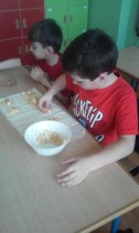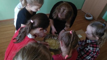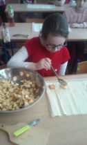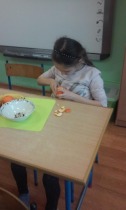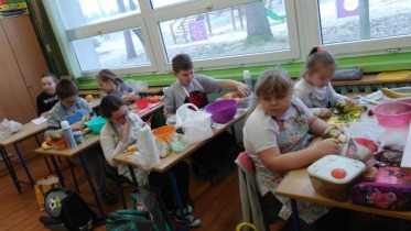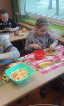 Od 5.02 do 9.02 uczniowie klasy III realizowali tematy związane z potrawami, ich smakami i zapachami. W ramach zajęć lekcyjnych dzieci próbowały różnych przypraw, poznały ich smak i zapach. W środę, 7.02., dzieci smakowały herbat z cynamonem i z kardamonem. Następnego dnia wspólnie piekliśmy ciasteczka z jabłkami. Dzieci obrały i pokroiły jabłka, po czym przygotowały ciasteczka, które wszystkim smakowały. W piątek zrobiliśmy sałatki owocowe. Każdy przyniósł swoje ulubione owoce. Były jabłka, gruszki, mandarynki, banany, winogrono i truskawki. Wszystkie dzieci bardzo dobrze posługiwały się nożem podczas obierania owoców. Pracowały w ciszy i skupieniu. Zachowały porządek na swoich stanowiskach.
