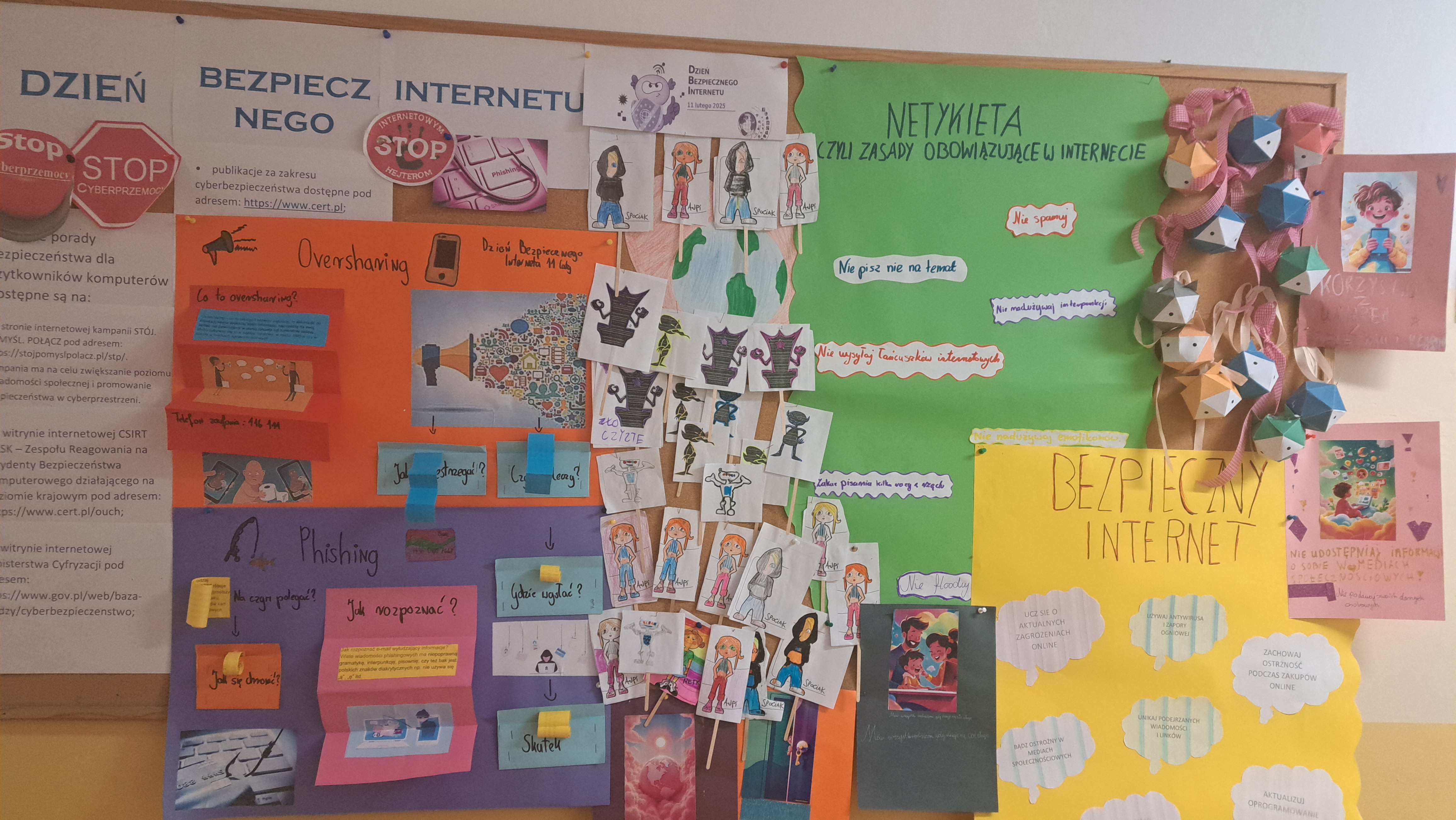 Klasy 4 - 6 Uczniowie przygotowali materiały informacyjne na szkolną gazetkę, zwracając uwagę na zagadnienia takie jak ochrona danych i cyberprzemoc. Uczestniczyli w pogadankach po projekcji filmów edukacyjnych, dyskutując o zagrożeniach w sieci i sposobach ich unikania.Czwartoklasiści stworzyli elektroniczną gazetkę, wyświetlaną na szkolnym korytarzu. Zawierała ona porady i ciekawostki dotyczące bezpiecznego korzystania z Internetu. Włączyli się też do programu edukacyjnego "Asy Internetu", ucząc się odpowiedzialnego korzystania z sieci. Zapoznali się tez z krainami Interlandii, w której odwiedzili Królestwo Życzliwości, Rzekę Rzeczywistości, Wyspę Skarbów oraz Górę Uważności. Zmagali się z hakerami, wyłudzaczami danych, niedyskretnymi udostępniaczami i hejterami. W ten sposób uczyli się, jak sobie z nimi radzić w realnym świecie.