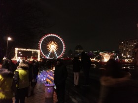 Wieczór: Po zmroku poszliśmy na Jarmark Bożonarodzeniowy. Kupowaliśmy pamiątki, słodycze, drobne przekąski. Przyglądaliśmy się świątecznemu wystrojowi kramów, budek, szopek i piramidy. Ci odważniejsi przejechali się Kołem Młyńskim i mogli oglądać panoramę Berlina z wysokości 60 m!