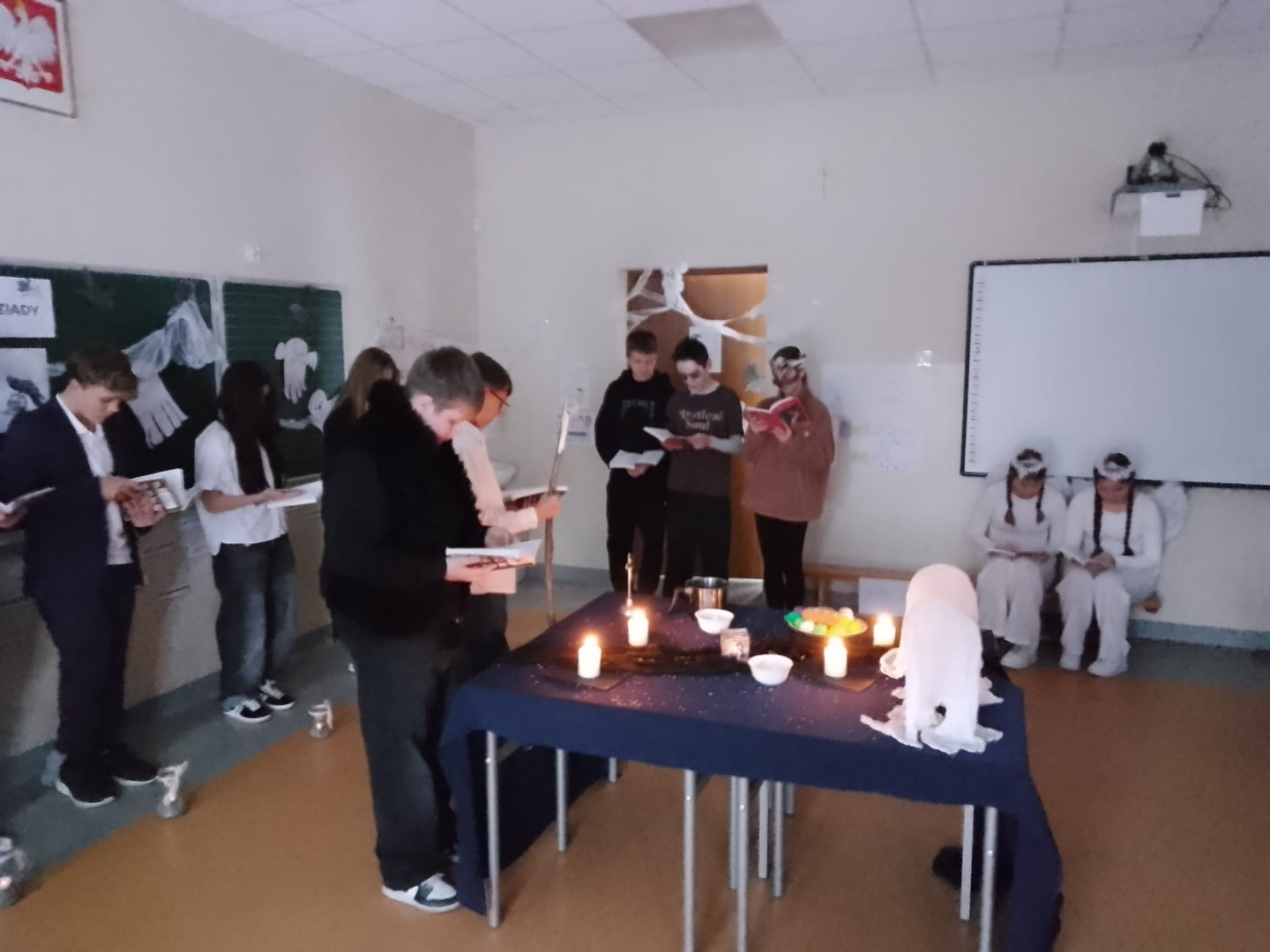 W dniu 24 listopada siódmoklasiści zaprosili uczniów klasy szóstej i ósmej na inscenizację „Dziadów” cz. II Adama Mickiewicza. Przedstawienie zostało przygotowane jako forma przybliżenia im treści lektury oraz tradycji obrzędów ludowych.