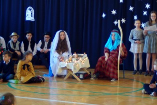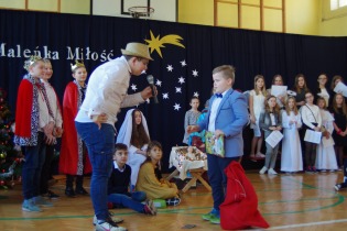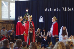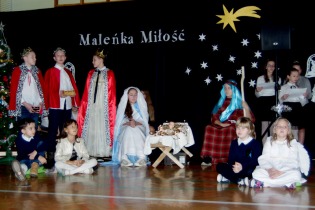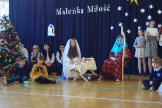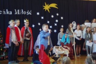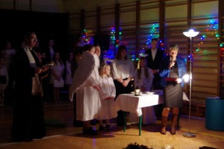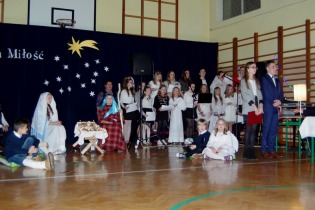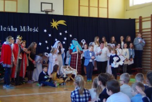 Tego wieczoru, zazwyczaj rozgadani i rozbawieni uczniowie, w ciszy i skupieniu, z anielskimi uśmiechami na buziach, oczekiwali na swój świąteczny występ. Poprzedziło go powitanie gości przez Panią Dyrektor Magdalenę Mikołajczyk słowami: „ Maleńka Miłość niech zrodzi się w każdym z nas, w każdej rodzinie, w naszej szkole. Dziękuję przyjaciołom szkoły, sponsorom, rodzicom za wszelkie dobro”. W klimat zbliżających się świąt wprowadziły słowa ks. Grzegorza Mituły, przypominające historię i rangę opłatka, którym się dzielimy w Wigilię Bożego Narodzenia oraz odczytanie fragmentu z Pisma Świętego. Następnie wszyscy mieli okazję złożyć sobie życzenia, które wypływały z głębi serca. W tle Trzej Mędrcy ze Wschodu przestępowali już niecierpliwie z nogi na nogę, w oczekiwaniu na jasełka sprawdzając, czy aby złoto, kadzidło i mirra nie uległy zniszczeniu.