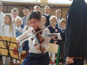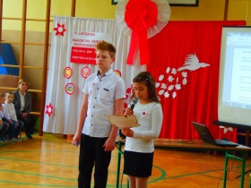 Pierwsza zaczęła klasa „0”, która odśpiewała nasz hymn narodowy. Wszyscy pozostali im towarzyszyli. Uczniowie poszczególnych klas również mieli gotowe do odśpiewania ciekawe utwory, a mianowicie: „Rozszumiały się wierzby płaczące”, „O mój rozmarynie”, „Rozkwitały pąki białych róż” i wiele innych. Widoczne było, że występujący czuli patriotyczny klimat, a wystrój sali temu odpowiadał, ponieważ miał biało-czerwone barwy. Pan Tomasz, muzyk naszej szkoły, przygrywał melodie na swoim instrumencie, a uczennica klasy VI pod koniec zagrała na skrzypcach „Rotę”. Młodzież i dzieci przyglądali się występowi.