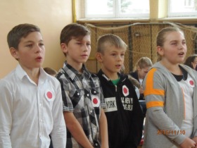 Gdy wszyscy już zebrali się na miejscu, wspólnie zaśpiewano Mazurka Dąbrowskiego, po czym uczniowie przystąpili do zaprezentowania poszczególnych pieśni. Młodym śpiewakom przygrywał nauczyciel muzyki - pan Tomasz Smoliński. Kiedy wspaniałe pieśni patriotyczne zostały odśpiewane, głos zabrała Pani Dyrektor. Podziękowała ona wszystkim pracownikom szkoły za trud włożony w przygotowanie apelu oraz przypomniała o obowiązku wywieszenia flagi w Narodowe Święto Niepodległości.