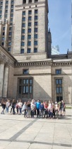 Drugi dzień naszego pobytu w Warszawie rozpoczęliśmy od śniadania, po którym wyruszyliśmy do Muzeum Ewolucji. Muzeum Ewolucji składa się z czterech niewielkich pomieszczeń, a najciekawszym jego punktem jest skamielina Tarbosaurusa bataar’a. Jest to azjatycki krewny amerykańskiego T.rexa. Szkielet zajmuje praktycznie całą salę i daje odczuć, jak bardzo natura jest twórcza, a życie poszczególnych gatunków kruche. Człowiek przy niej czuje się naprawdę maleńki i bezbronny. Oprócz dużych skamielin – w Muzeum Ewolucji znajduje się cała masa mniejszych eksponatów np. skamieniałe jaja dinozaurów, fragmenty czaszek małych ssaków i kilka wypchanych małych zwierząt. Jest też kilka plastikowych reprodukcji gadów m.in. tiktaalików – ogniw pośrednich między rybami a płazami, które jako pierwsze wyszły na ląd. Niewątpliwie atrakcją był wjazd na trzydzieste piętro Pałacu Kultury i Nauki, skąd mieliśmy możliwość podziwiać panoramę Warszawy z wysoka. Później pieszo udaliśmy się na Grób Nieznanego Żołnierza i spacer Krakowskim Przedmieściem.